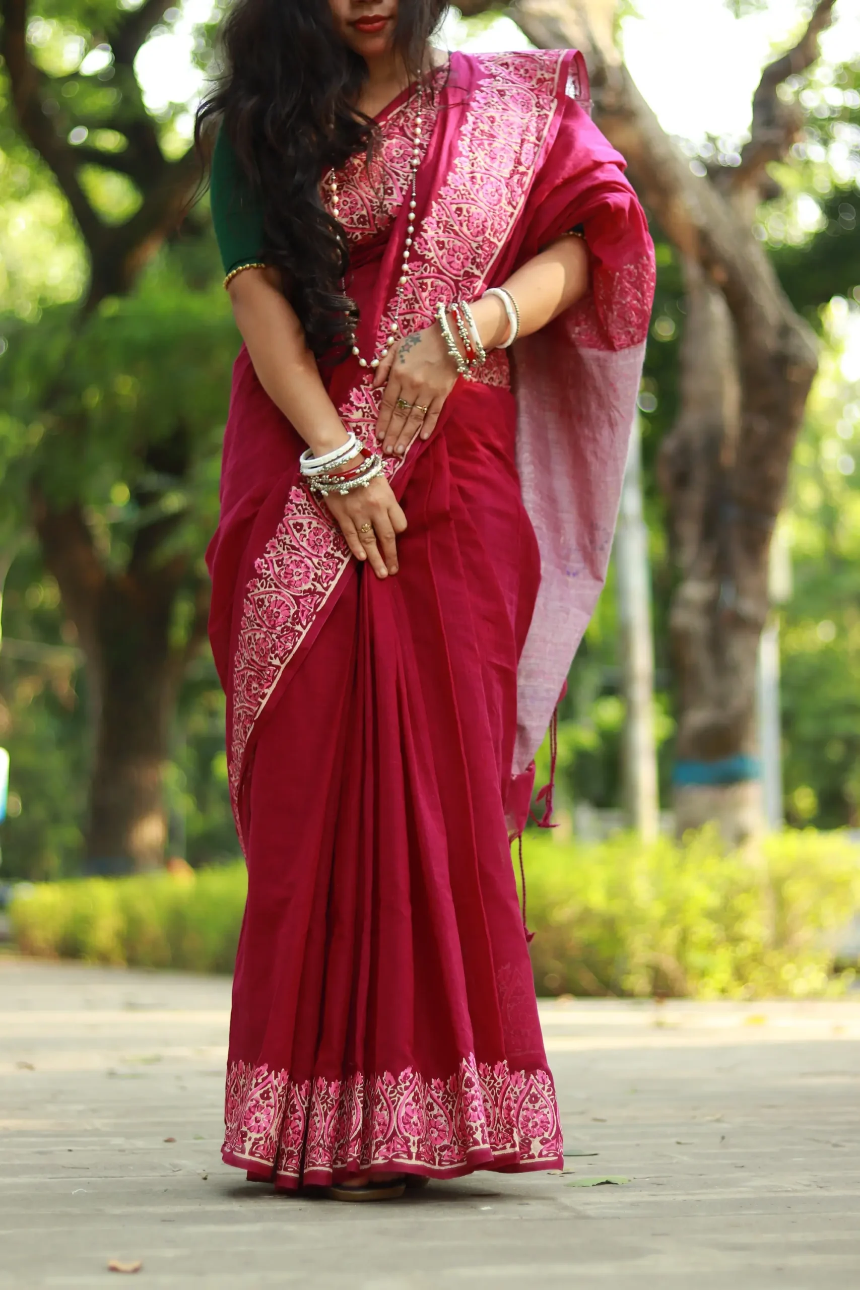 ম্যাজেন্টা রঙের জমিনে সোনালি-গোলাপি হ্যান্ড ব্লক প্রিন্ট – প্রতিটি রেখায় আছে রুচি আর রাজকীয়তা। ফোকাল ইভেন্ট বা উৎসবে আপনি হয়ে উঠুন অনন্য।