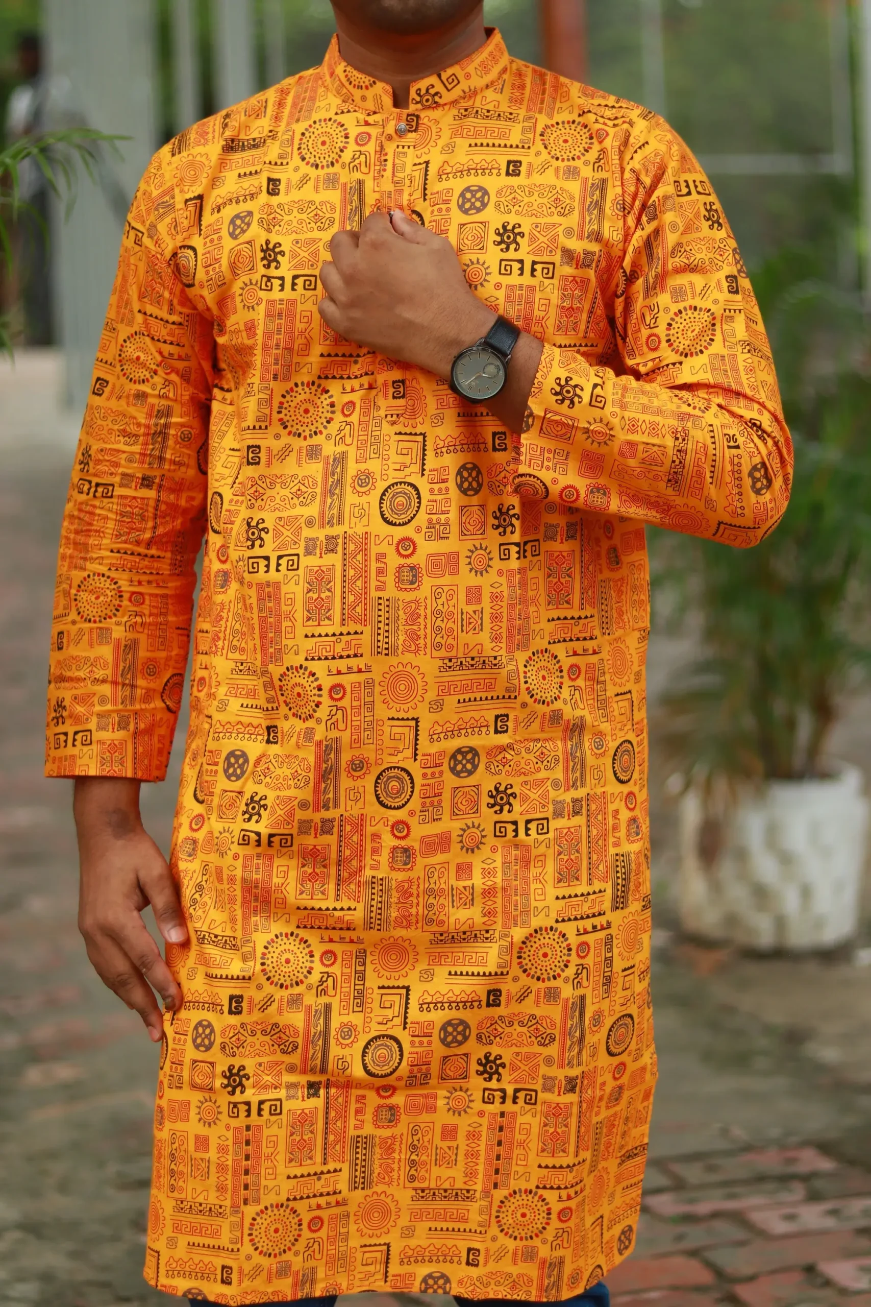 প্রিমিয়াম কটন ফেব্রিকে উজ্জ্বল হলুদের উপর হাতে আঁকা আলপনা ডিজাইন – এই পাঞ্জাবিটি আপনার স্টাইলে যোগ করবে প্রাণ, পরিশুদ্ধতা আর ঐতিহ্যের স্পর্শ।