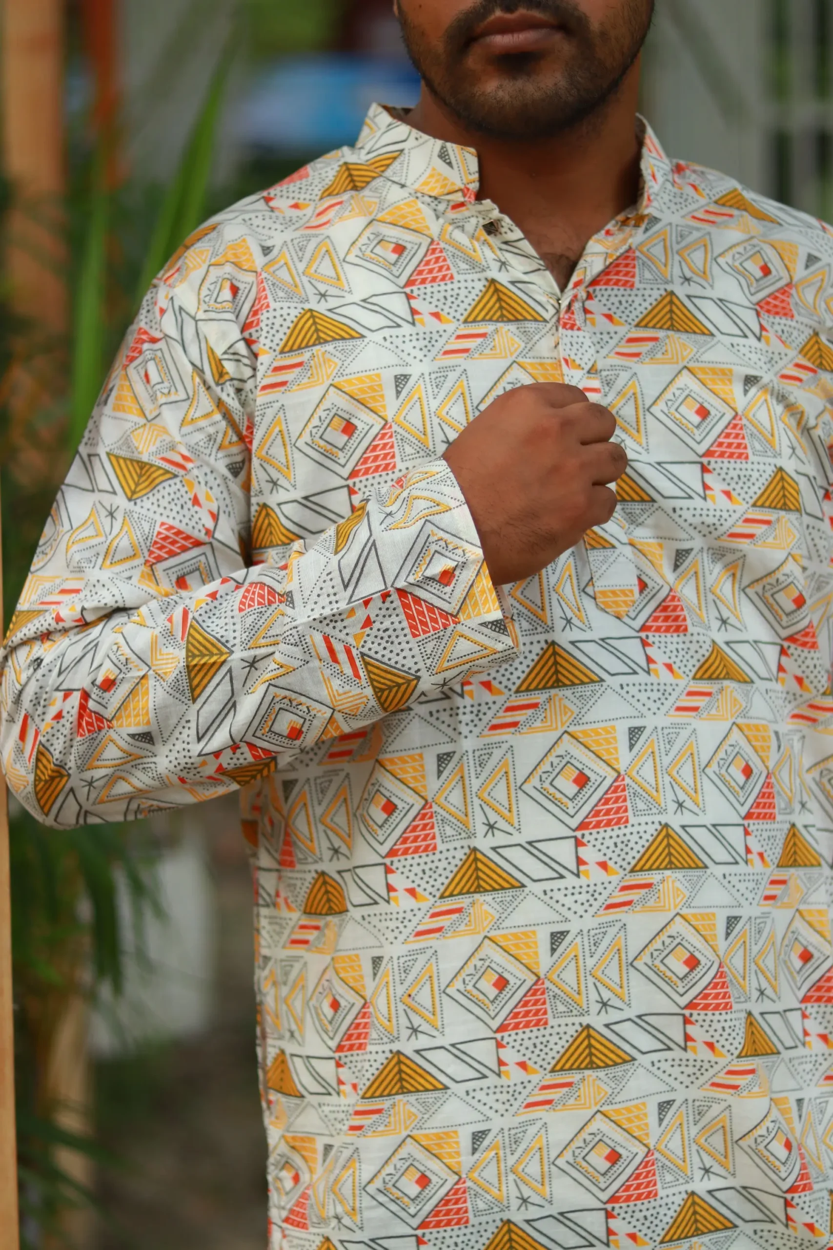 সাদা রঙে হাতে আঁকা আলপনা মোটিফে তৈরি এই পাঞ্জাবিটি হলো এক নিঃশব্দ অথচ স্পষ্ট স্টাইল স্টেটমেন্ট। উৎসব, গিফট বা daywear – সর্বত্রই মানানসই এই শুভ্র সৌন্দর্য।