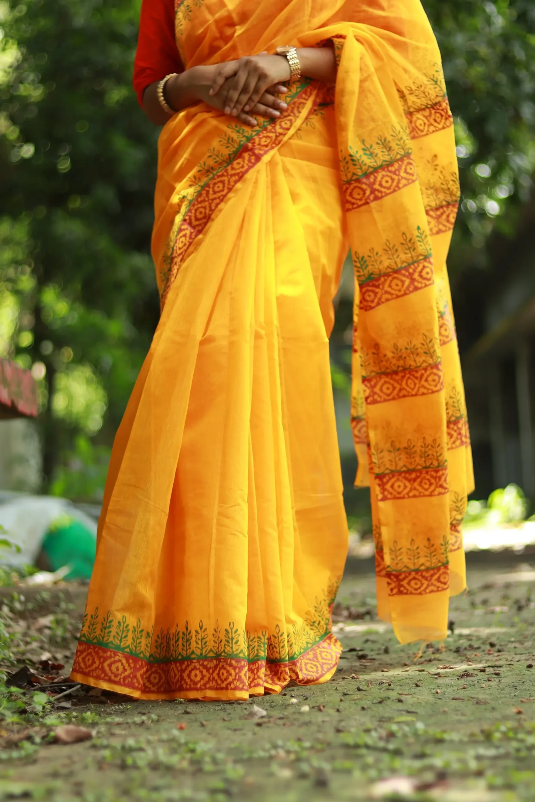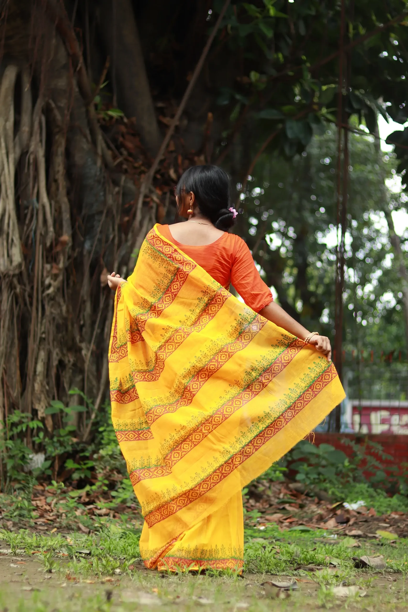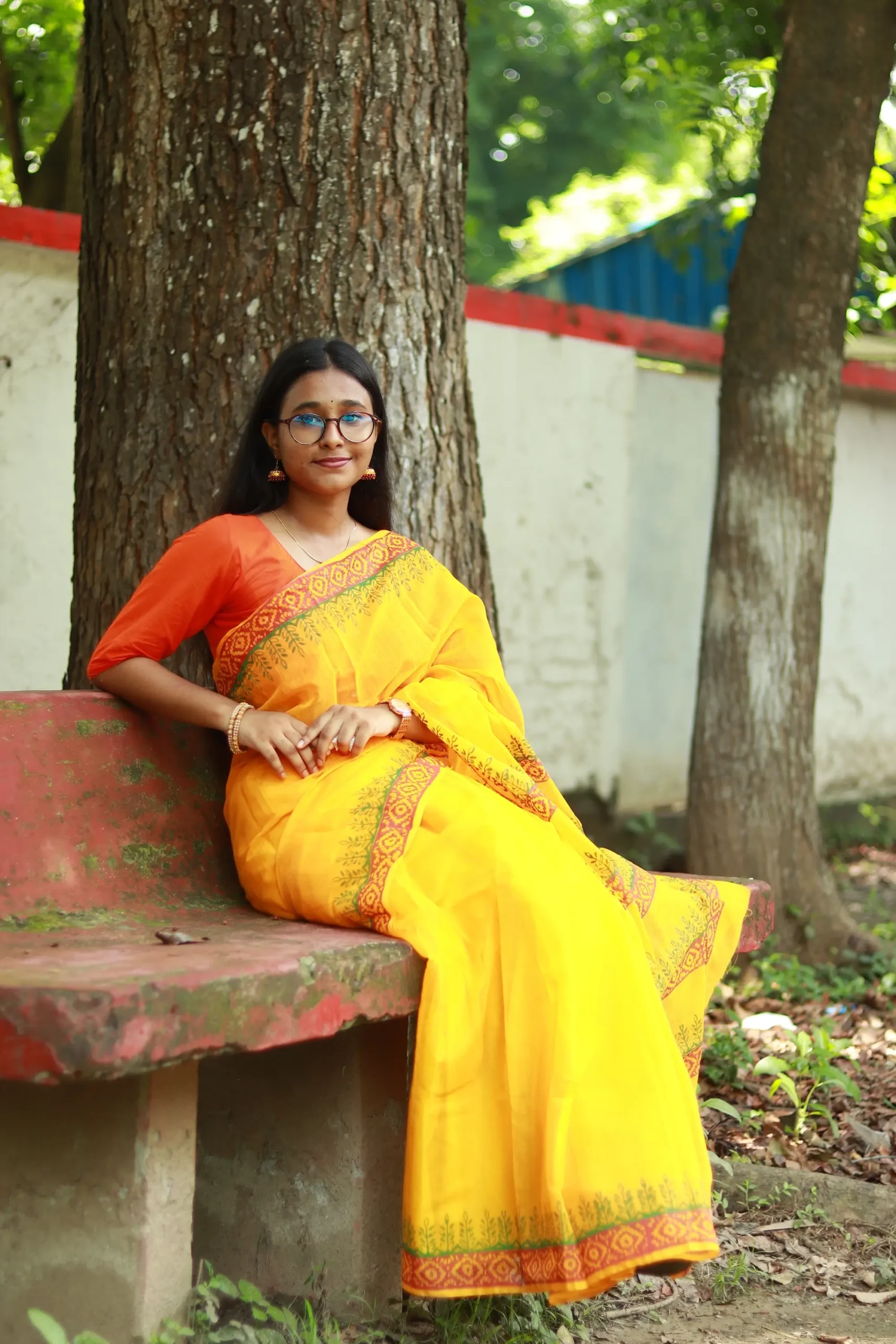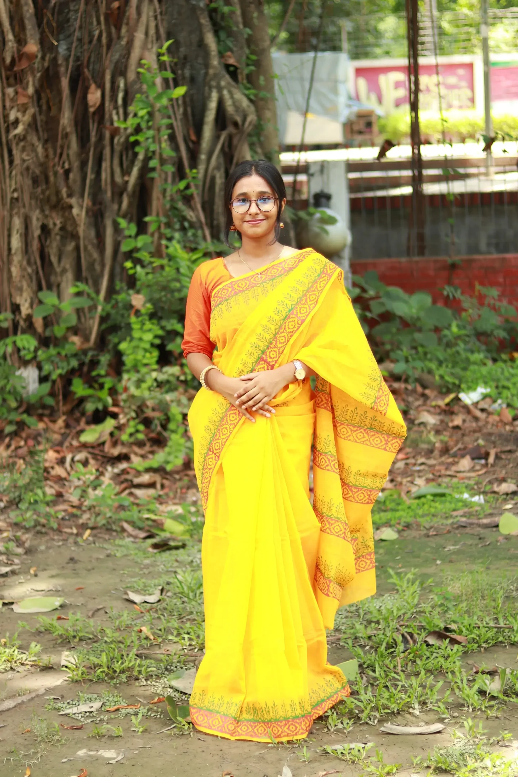 উজ্জ্বল হলুদ বডির উপর লাল-কমলা এবং সবুজের নরম অথচ জীবন্ত ব্লক প্রিন্ট পুরো শাড়িটিকে দিয়েছে এক দীপ্তিময় চেহারা।
