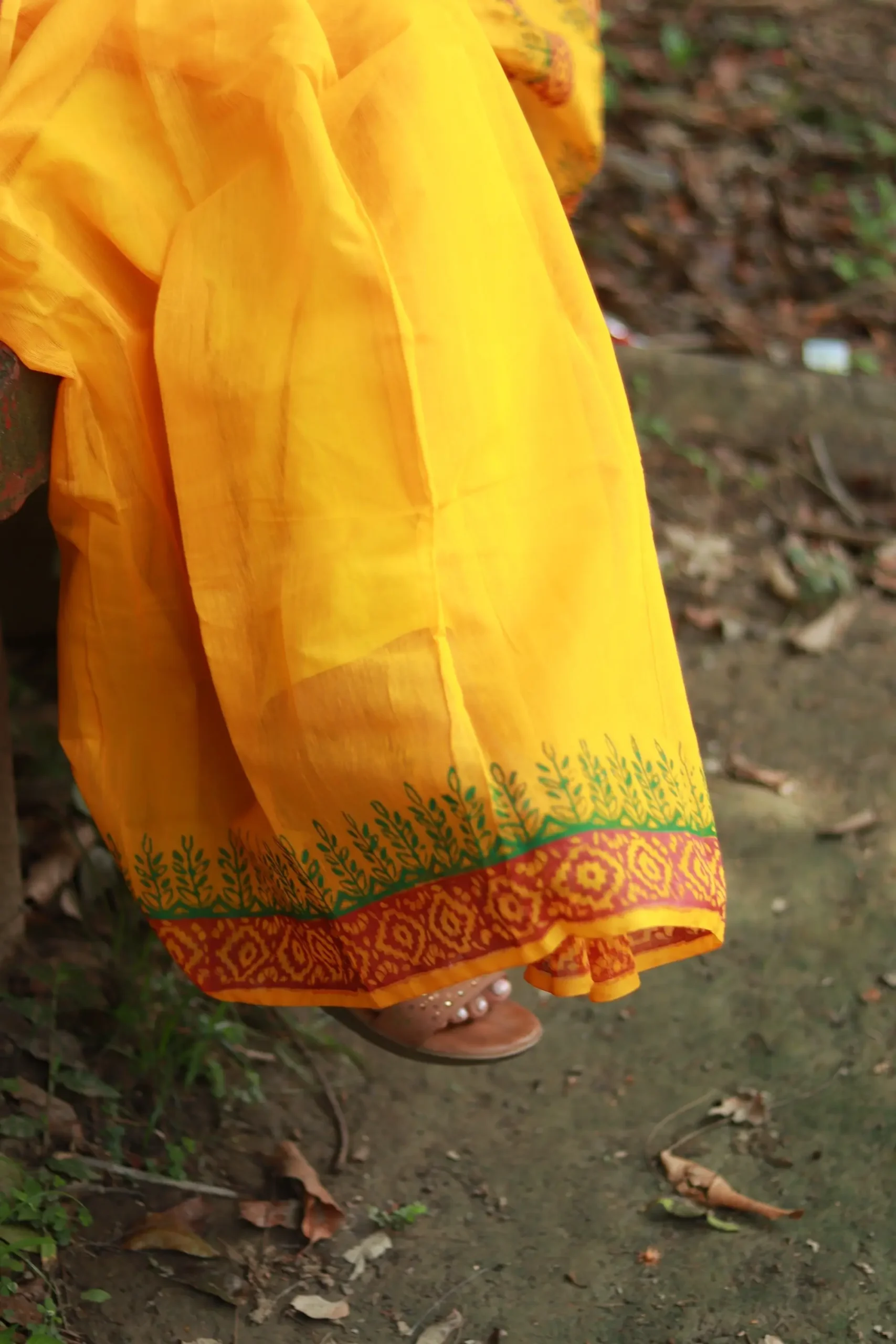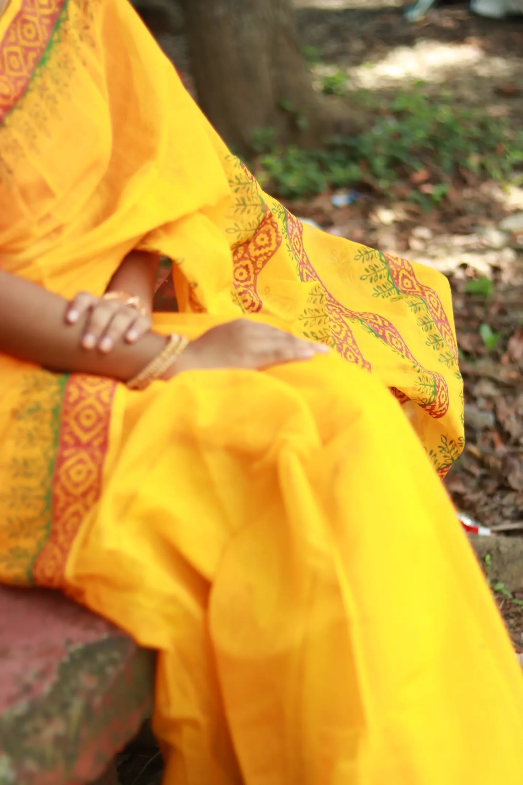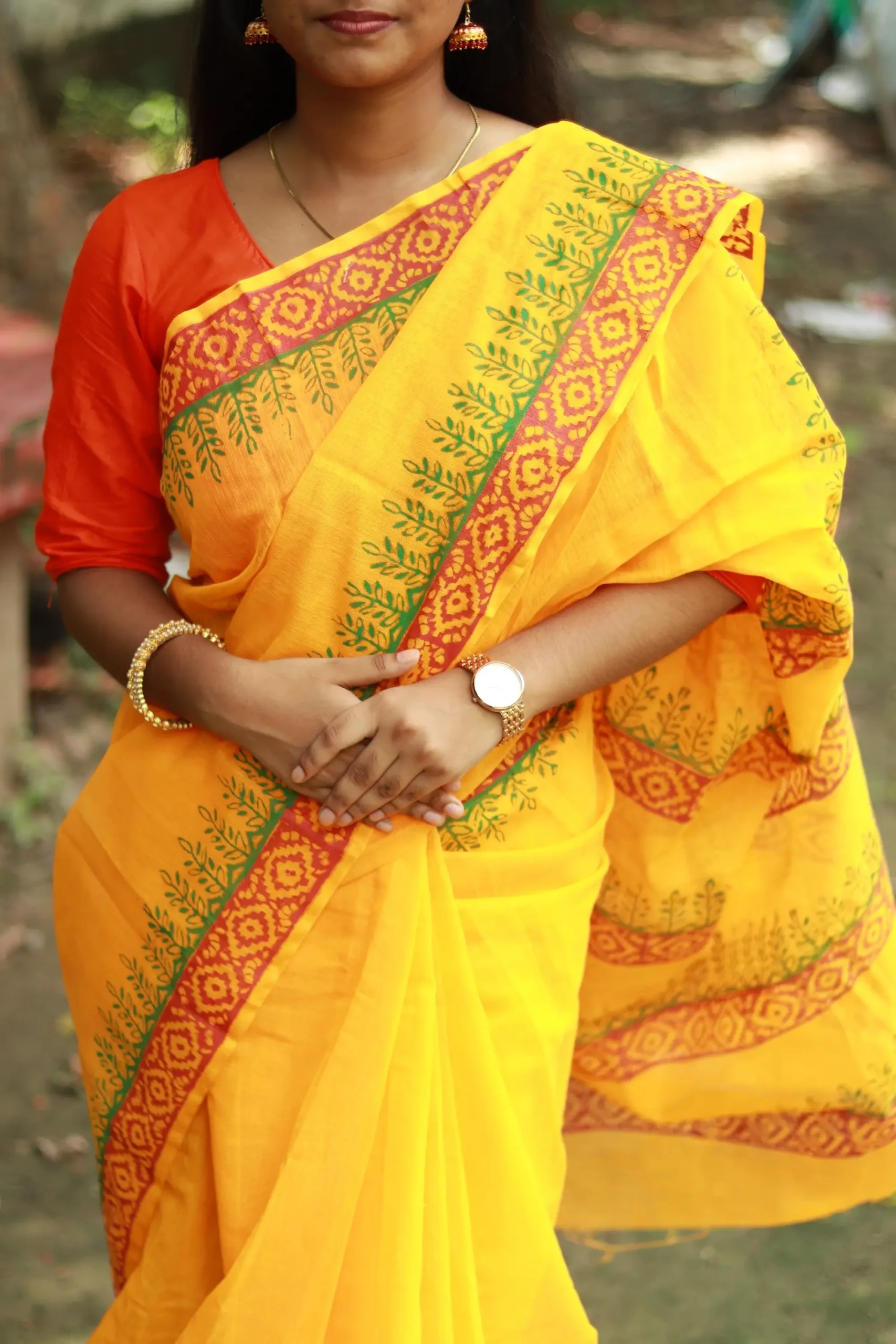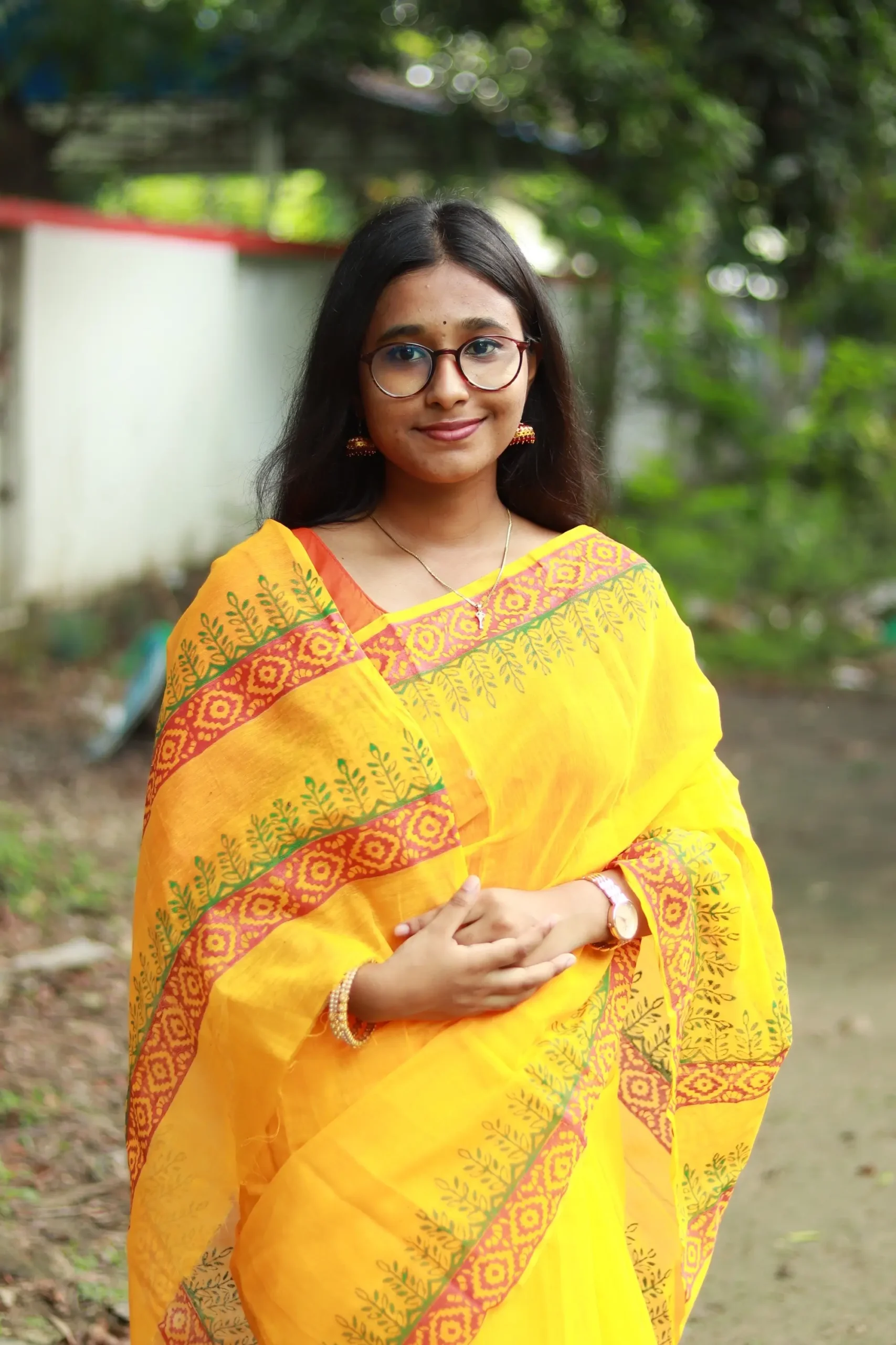 উজ্জ্বল হলুদ বডির উপর লাল-কমলা এবং সবুজের নরম অথচ জীবন্ত ব্লক প্রিন্ট পুরো শাড়িটিকে দিয়েছে এক দীপ্তিময় চেহারা।