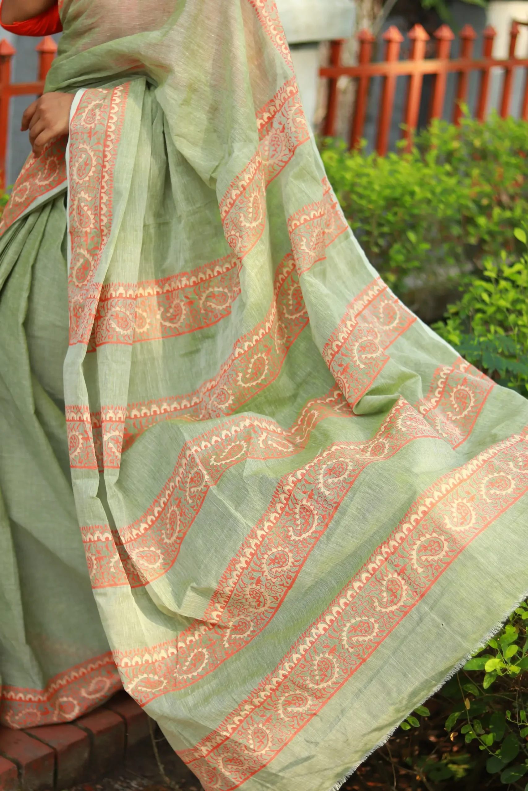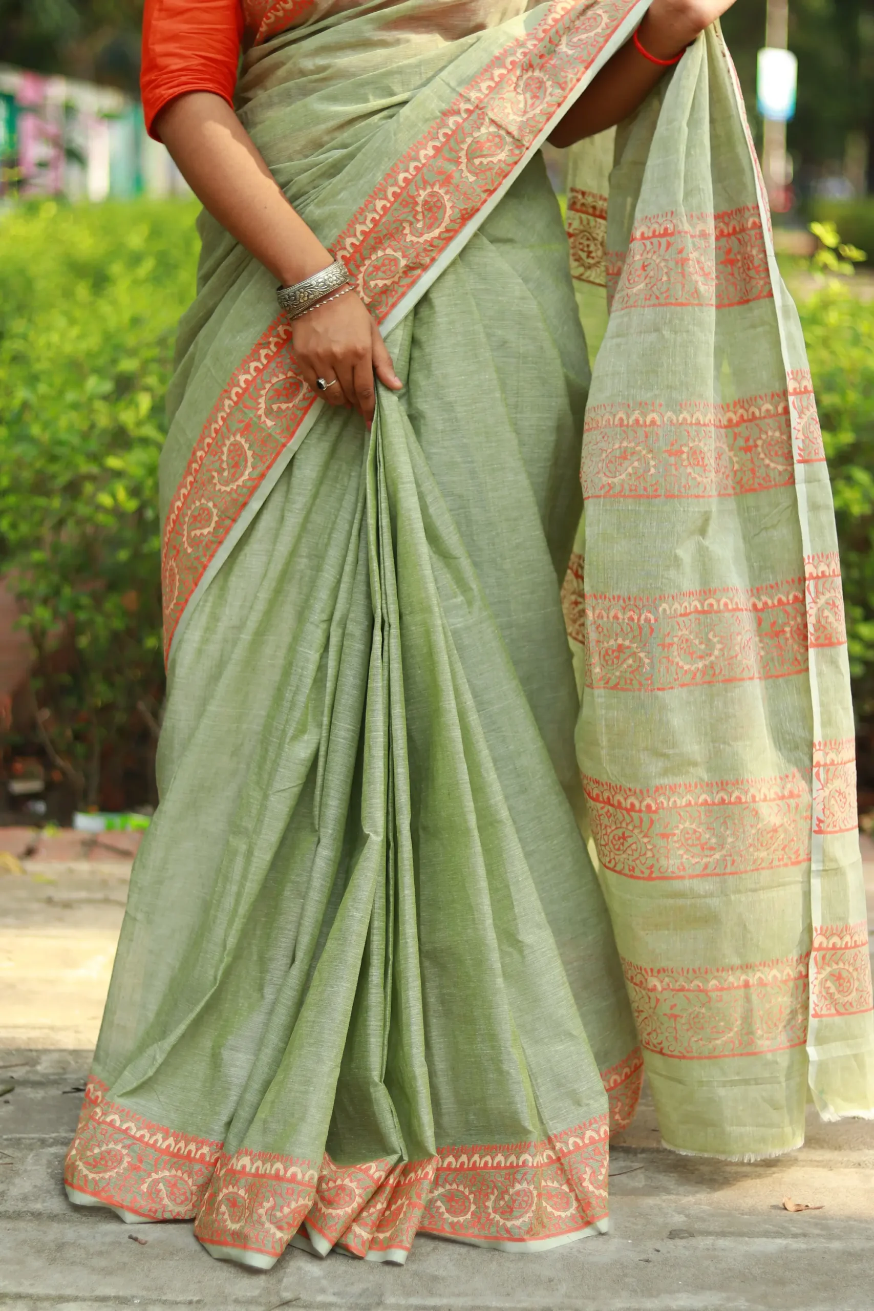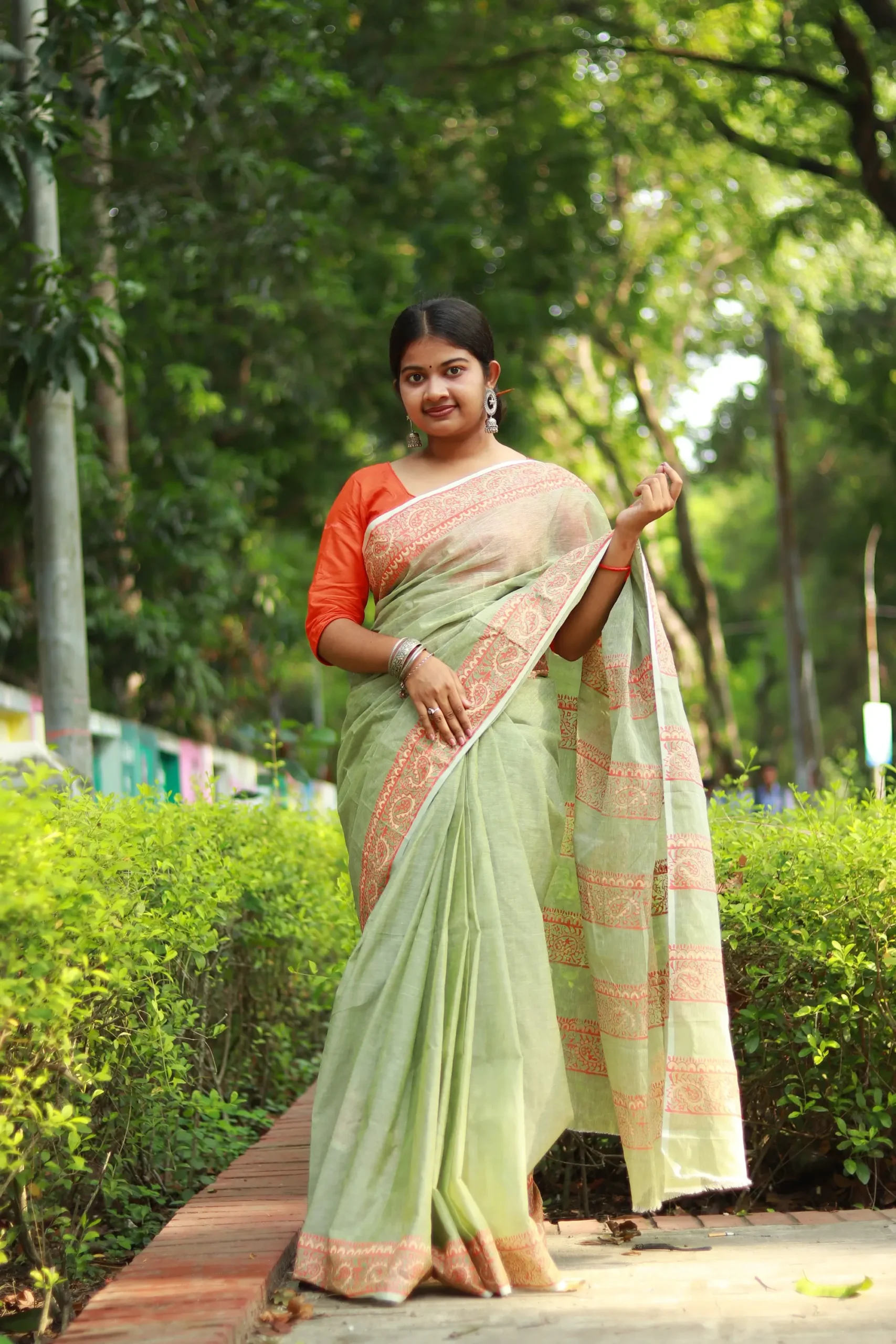 হালকা সবুজ রঙের সুতি শাড়ি, যার গায়ে ছাপা লালচে ব্লক নকশা – এ যেন মাটির গন্ধ মিশে থাকা এক শান্ত, পরিশীলিত বাঙালি ঐতিহ্যের প্রতিচ্ছবি।