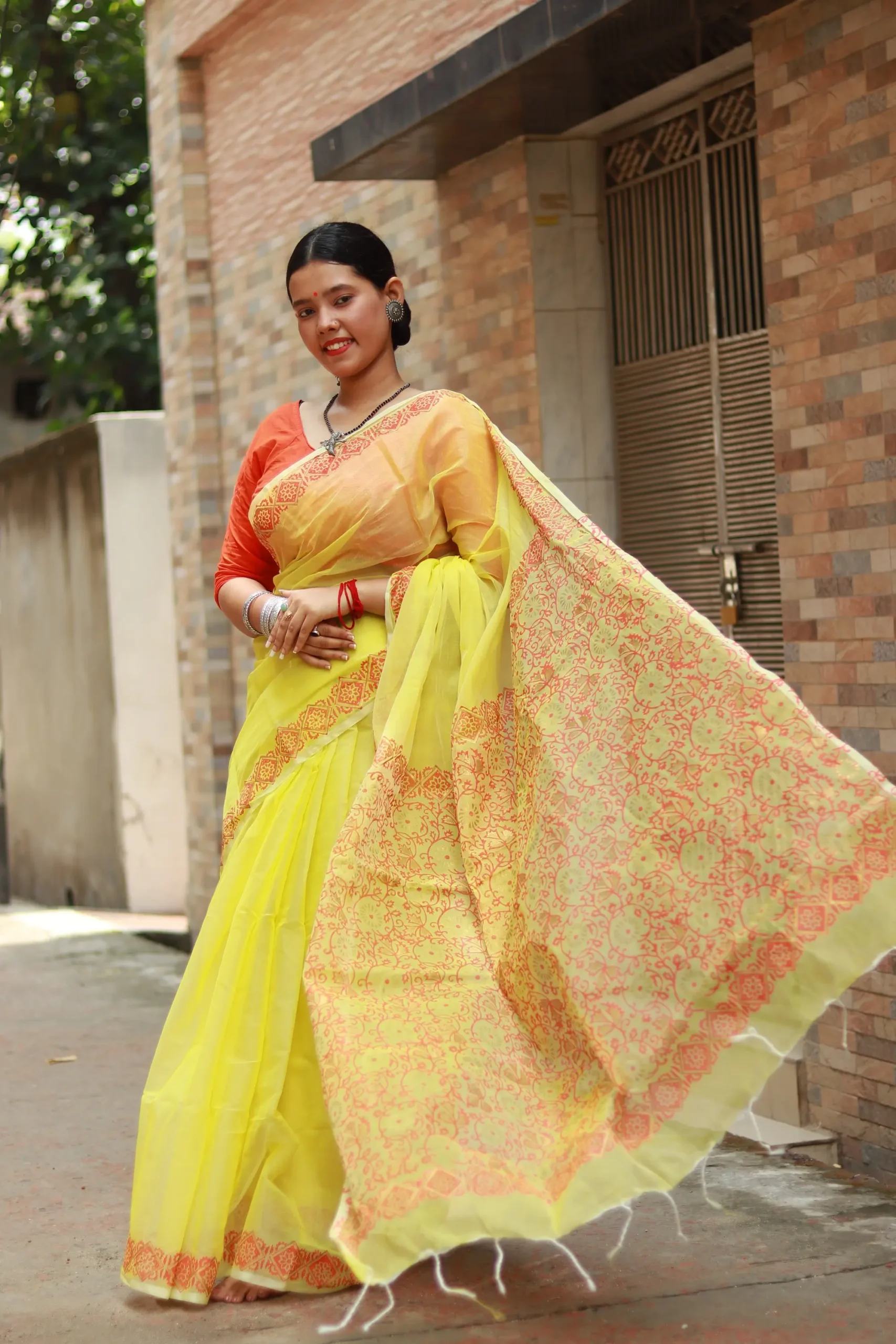 ১৩ হাত সেমি মসলিন ফেব্রিকে হালকা হলুদ ক্যানভাসে ফুটে উঠেছে লাল রঙের ব্লকপ্রিন্ট—”Koli O Rong” এক timeless classic, যেখানে প্রতিটি কলি আর প্রতিটি ছাপ বয়ে আনে রুচির পরিপূর্ণতা।