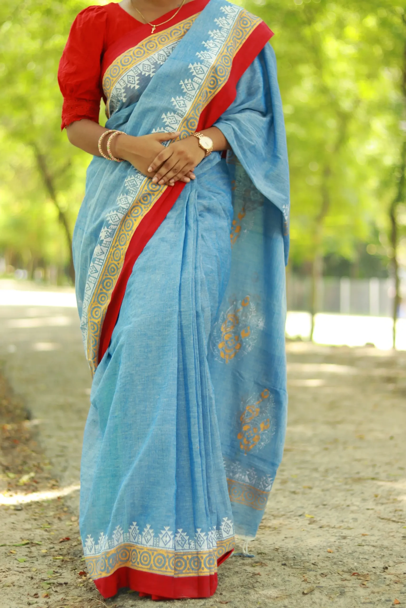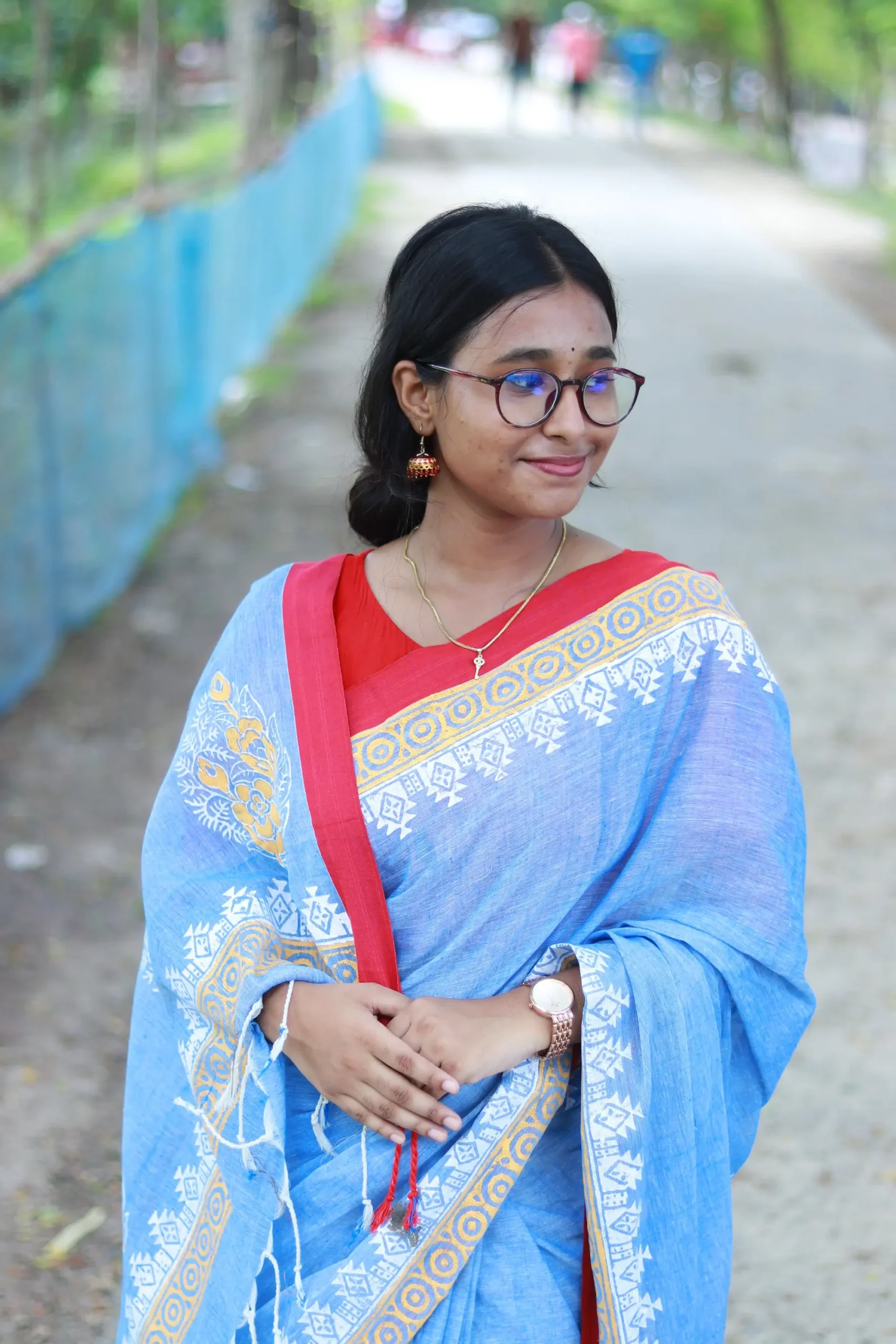 Krishnokoli Niloy – Elegant Blue Block Printed Saree in Andy Cotton