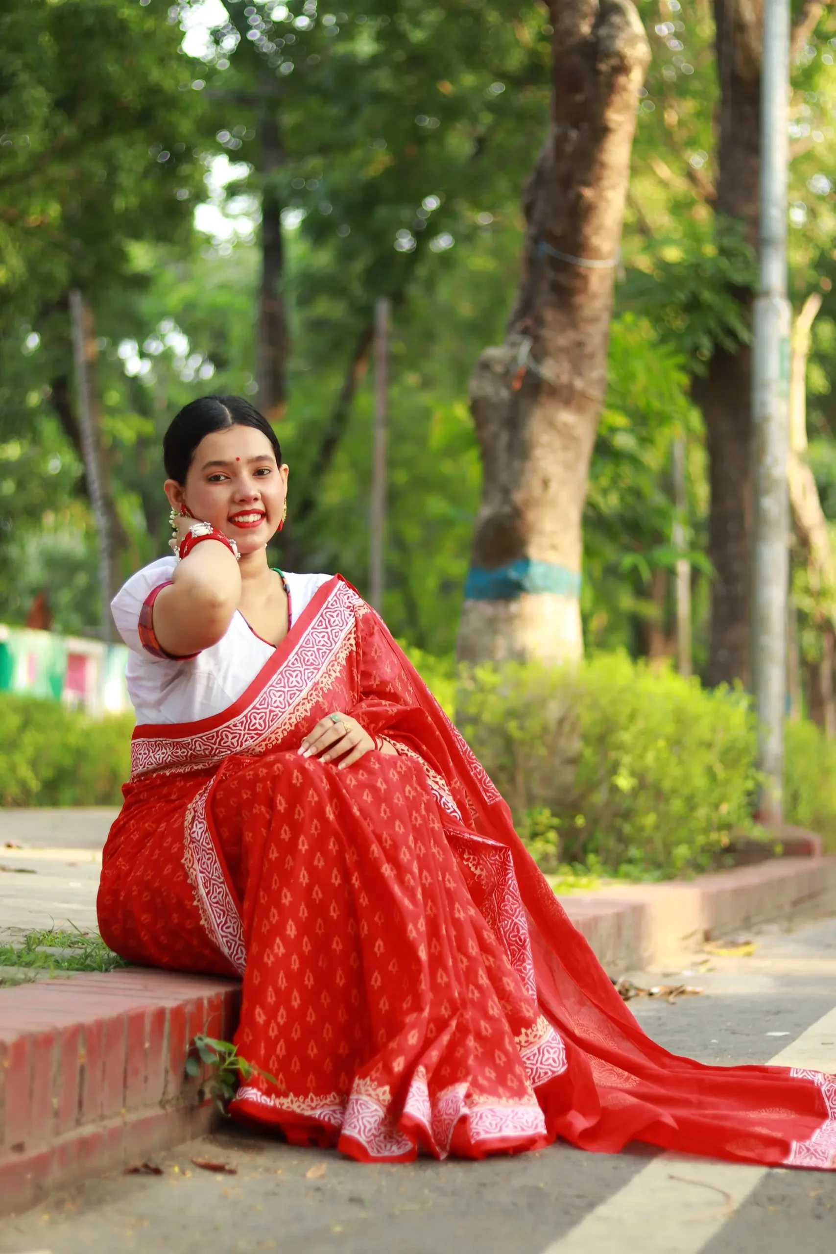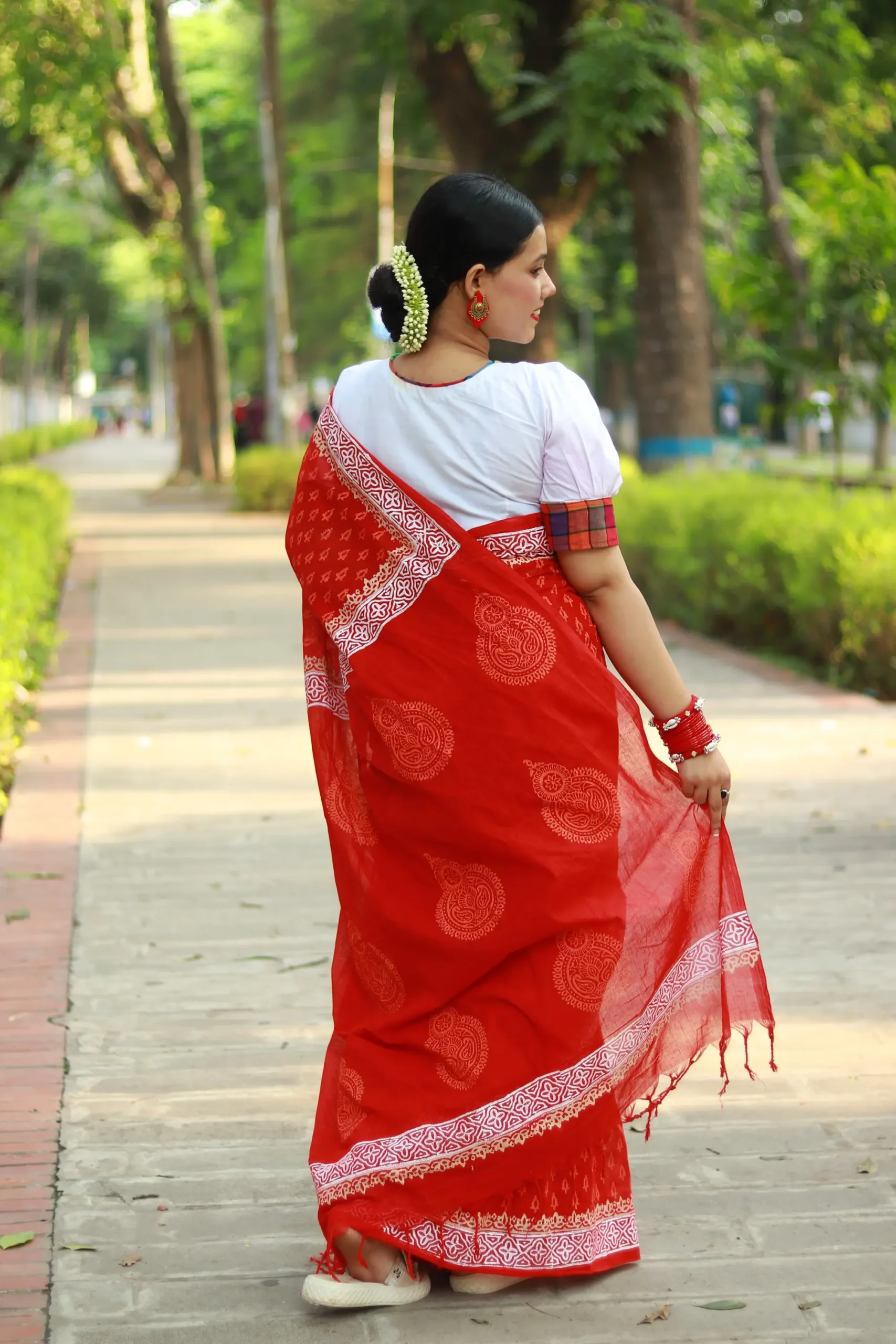 Ranga Alpona – উজ্জ্বল লাল ব্লক প্রিন্টেড কটন শাড়ি